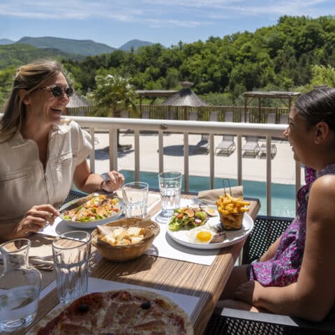 Wenn Sie Ihren Aufenthalt auf unserem Campingplatz in der Drôme buchen, kommen Sie in den Genuss aller unserer hochwertigen Dienstleistungen. Egal ob Sie in einem Mobilheim oder auf einem Stellplatz untergebracht sind, Sie haben Zugang zu WLAN. Zum Mittag- oder Abendessen sitzen Sie im 180 m² großen Panoramasaal unseres Restaurants und der Bar mit Blick auf den Wasserpark.